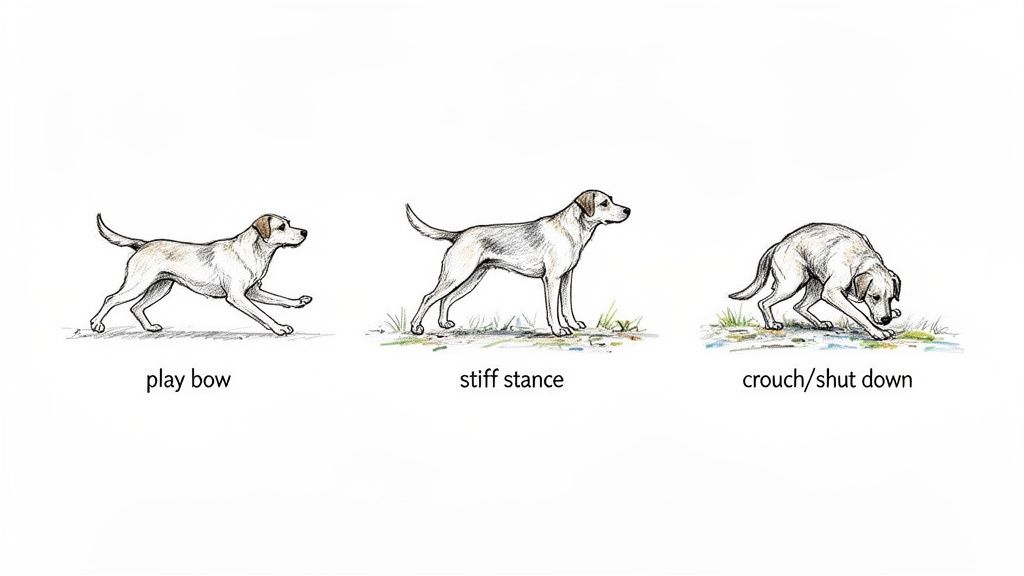 Learning to interpret these signals takes you from guessing to knowing. Mistaking a stiff, high-held tail for a friendly wag can spark a conflict, and missing a subtle stress signal like a quick lip lick can turn a fun hike into a seriously overwhelming ordeal for your dog. It's about learning to see the world through their eyes, not just our own.