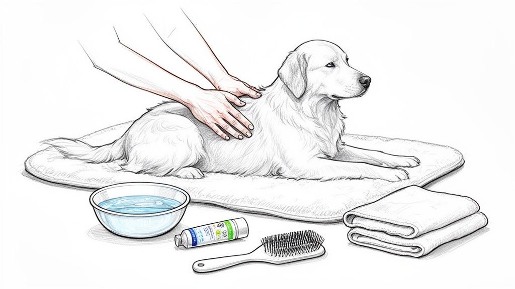 This is more than just a bath; it's about creating a calm, positive vibe from start to finish. Since many dogs get anxious about grooming, your main goal is to turn it into an enjoyable ritual. A big part of that is learning how to calm dog anxiety naturally so the experience is rewarding, not stressful.