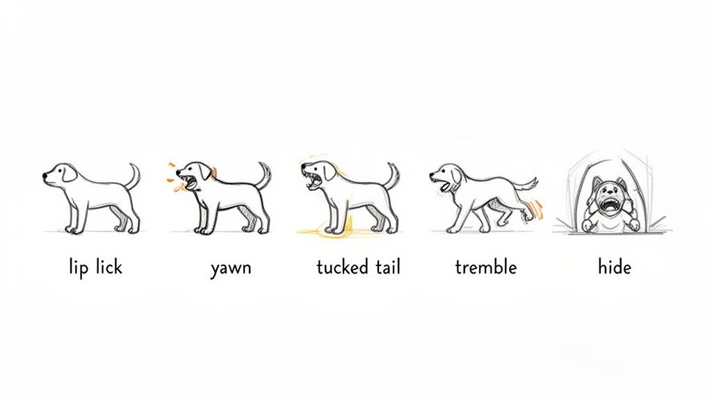 The signs of storm anxiety in dogs fall along a spectrum. Some are so subtle they’re easy to miss or brush off as a weird quirk, while others are impossible to ignore. Paying close attention to those smaller signals is key, as they are your dog's first attempts to tell you, "I'm not okay."