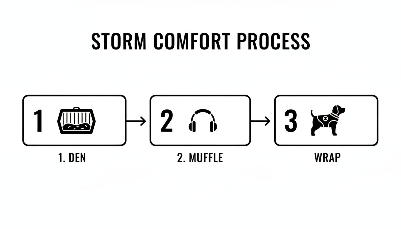 If your dog is already crate-trained, you're one step ahead. Their crate is the ideal foundation for a storm shelter. Just drape a few heavy blankets over it to help block out sound and light. The golden rule? Always leave the door open so they feel in control and never trapped. Getting the right size is also key to that feeling of security; a comprehensive guide to dog kennel sizing can help you make sure their den is a perfect, comforting fit.