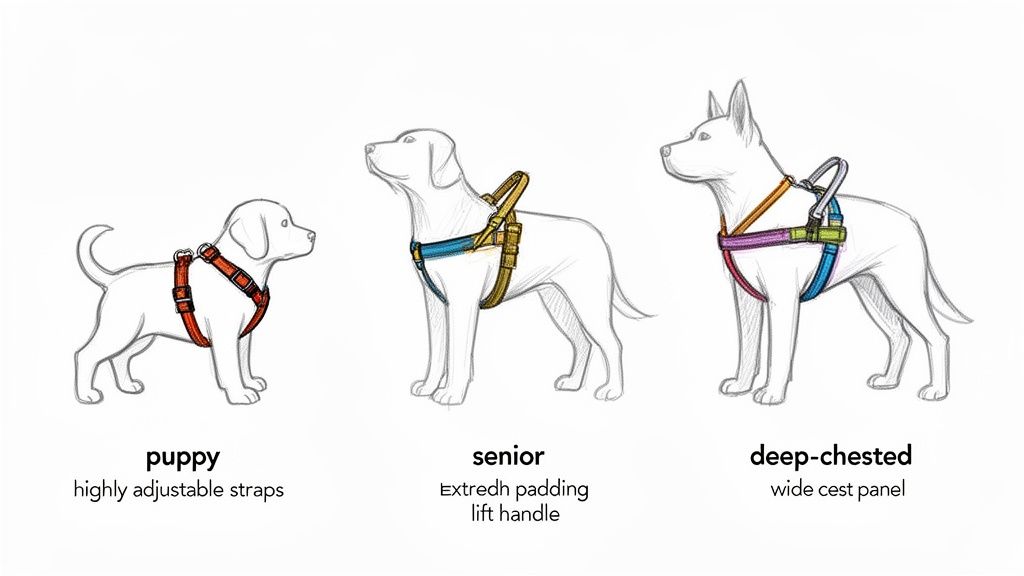 Choosing the right model means getting specific. A lanky, growing puppy has completely different needs than a wise old trail veteran. And a powerful, high-energy breed requires a harness built to a much higher standard than one for a dog with a unique build, like a deep-chested Weimaraner. This is about making sure they're not just safe, but genuinely comfortable enough to love every minute of the adventure.