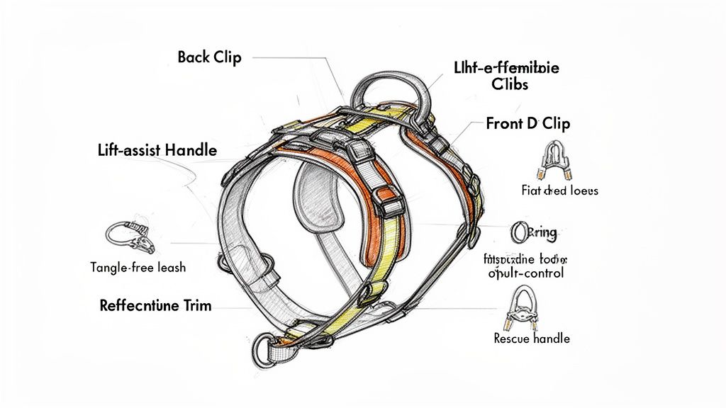 When you look closely at a top-tier hiking harness, you'll see every element has a purpose. It's engineered to spread out pressure, allow your dog to move freely, and hold up to whatever the wilderness throws at it. Let's break down what really matters.